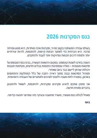 %u05db%u05e0%u05e1 %u05d4%u05e1%u05e7%u05e8%u05e0%u05d5%u05ea 2026%u05d1%u05e2%u05d5%u05dc%u05dd %u05e2%u05d1%u05d5%u05d3%u05d4 %u05d4%u05de%u05e9%u05ea%u05e0%u05d4 %u05d1%u05e7%u05e6%u05d1 %u05de%u05d4%u05d9%u05e8, %u05e1%u05e7%u05e8%u05e0%u05d5%u05ea %u05d0%u05d9%u05e0%u05d4 %u05de%u05d5%u05ea%u05e8%u05d5%u05ea, %u05d4%u05d9%u05d0 %u05de%u05e0%u05d5%u05e2 %u05e6%u05de%u05d9%u05d7%u05d4 %u05de%u05e8%u05db%u05d6%u05d9. %u05d4%u05d9%u05d0 %u05d4%u05db%u05e8%u05d7%u05d9%u05ea %u05db%u05d3%u05d9 %u05dc%u05d0%u05ea%u05d2%u05e8 %u05d4%u05e0%u05d7%u05d5%u05ea %u05e7%u05d9%u05d9%u05de%u05d5%u05ea, %u05dc%u05d4%u05ea%u05e0%u05e1%u05d5%u05ea, %u05dc%u05d4%u05d9%u05d5%u05ea %u05d9%u05e6%u05d9%u05e8%u05ea%u05d9%u05d9%u05dd %u05d9%u05d5%u05ea%u05e8 %u05d5%u05dc%u05e4%u05ea%u05d7 %u05d3%u05e8%u05db%u05d9%u05dd %u05d7%u05db%u05de%u05d5%u05ea %u05d5%u05de%u05d3%u05d5%u05d9%u05e7%u05d5%u05ea %u05d9%u05d5%u05ea%u05e8 %u05dc%u05e2%u05d1%u05d5%u05d3 %u05d5%u05dc%u05d4%u05ea%u05e7%u05d3%u05dd.%u05d4%u05e9%u05e0%u05d4 %u05d1%u05d7%u05e8%u05e0%u05d5 %u05dc%u05e9%u05e0%u05d5%u05ea %u05e7%u05d5%u05e0%u05e1%u05e4%u05d8: %u05d1%u05de%u05e7%u05d5%u05dd %u05d4%u05e8%u05e6%u05d0%u05d5%u05ea %u05d4%u05e2%u05e9%u05e8%u05d4, %u05d1%u05e0%u05d9%u05e0%u05d5 %u05db%u05e0%u05e1 %u05d4%u05de%u05d1%u05d5%u05e1%u05e1 %u05e2%u05dc %u05e1%u05d3%u05e0%u05d0%u05d5%u05ea %u05de%u05e2%u05e9%u05d9%u05d5%u05ea %u2013 %u05db%u05d0%u05dc%u05d4 %u05e9%u05de%u05d6%u05de%u05d9%u05e0%u05d5%u05ea %u05d4%u05ea%u05e0%u05e1%u05d5%u05ea %u05d1%u05db%u05dc%u05d9%u05dd %u05d7%u05d3%u05e9%u05d9%u05dd, %u05de%u05e7%u05d3%u05de%u05d5%u05ea %u05ea%u05d5%u05d1%u05e0%u05d5%u05ea %u05d5%u05d9%u05db%u05d5%u05dc%u05d5%u05ea %u05e9%u05e0%u05d9%u05ea%u05df %u05dc%u05d9%u05d9%u05e9%u05dd %u05db%u05d1%u05e8 %u05d1%u05d9%u05d5%u05dd %u05e9%u05d0%u05d7%u05e8%u05d9.%u05ea%u05de%u05d4%u05d9%u05dc %u05d4%u05e1%u05d3%u05e0%u05d0%u05d5%u05ea %u05e0%u05d1%u05e0%u05d4 %u05de%u05ea%u05d5%u05da %u05e8%u05d0%u05d9%u05d9%u05d4 %u05e8%u05d7%u05d1%u05d4 %u05e9%u05dc %u05db%u05dc%u05dc %u05d4%u05de%u05d7%u05dc%u05e7%u05d5%u05ea %u05d5%u05d4%u05ea%u05d7%u05d5%u05de%u05d9%u05dd %u05d1%u05d0%u05e8%u05d2%u05d5%u05df, %u05d1%u05de%u05d8%u05e8%u05d4 %u05dc%u05ea%u05ea %u05de%u05e2%u05e0%u05d4 %u05e8%u05dc%u05d5%u05d5%u05e0%u05d8%u05d9 %u05dc%u05e6%u05e8%u05db%u05d9%u05dd %u05d5%u05dc%u05d0%u05ea%u05d2%u05e8%u05d9%u05dd %u05e9%u05dc %u05d4%u05e2%u05d1%u05d5%u05d3%u05d4 %u05d4%u05d9%u05d5%u05de%u05d9%u05d5%u05de%u05d9%u05ea.%u05d0%u05e0%u05d9 %u05de%u05d6%u05de%u05d9%u05df %u05d0%u05ea%u05db%u05dd %u05dc%u05d4%u05d2%u05d9%u05e2 %u05e1%u05e7%u05e8%u05e0%u05d9%u05dd %u05d5%u05e1%u05e7%u05e8%u05e0%u05d9%u05d5%u05ea, %u05dc%u05d4%u05ea%u05e0%u05e1%u05d5%u05ea, %u05dc%u05e9%u05d0%u05d5%u05dc %u05d5%u05dc%u05d4%u05ea%u05d1%u05d5%u05e0%u05df %u05d1%u05d3%u05d1%u05e8%u05d9%u05dd %u05de%u05d6%u05d5%u05d5%u05d9%u05ea %u05d7%u05d3%u05e9%u05d4.%u05de%u05d0%u05d7%u05dc %u05dc%u05db%u05d5%u05dc%u05e0%u05d5 %u05db%u05e0%u05e1 %u05de%u05e2%u05e9%u05d9%u05e8, %u05de%u05e2%u05d5%u05e8%u05e8 %u05de%u05d7%u05e9%u05d1%u05d4 %u05d5%u05d1%u05e2%u05d9%u05e7%u05e8 %u05db%u05d6%u05d4 %u05e9%u05de%u05d9%u05d9%u05e6%u05e8 %u05ea%u05e0%u05d5%u05e2%u05d4 %u05e7%u05d3%u05d9%u05de%u05d4.%u05d1%u05d5%u05e2%u05d6