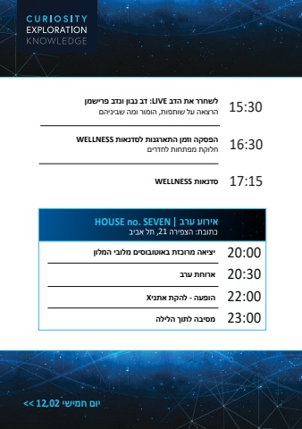 HOUSE no. SEVEN2100:22 %u05d4%u05d5%u05e4%u05e2%u05d4 - %u05dc%u05d4%u05e7%u05ea %u05d0%u05ea%u05e0%u05d9X30:20 %u05d0%u05e8%u05d5%u05d7%u05ea %u05e2%u05e8%u05d100:20 %u05d9%u05e6%u05d9%u05d0%u05d4 %u05de%u05e8%u05d5%u05db%u05d6%u05ea %u05d1%u05d0%u05d5%u05d8%u05d5%u05d1%u05d5%u05e1%u05d9%u05dd %u05de%u05dc%u05d5%u05d1%u05d9 %u05d4%u05de%u05dc%u05d5%u05dfWELLNESS %u05e1%u05d3%u05e0%u05d0%u05d5%u05ea 17:15%u05dc%u05e9%u05d7%u05e8%u05e8 %u05d0%u05ea %u05d4%u05d3%u05d1 LIVE :%u05d3%u05d1 %u05e0%u05d1%u05d5%u05df %u05d5%u05e0%u05d3%u05d1 %u05e4%u05e8%u05d9%u05e9%u05de%u05df 30:15%u05d4%u05e8%u05e6%u05d0%u05d4 %u05e2%u05dc %u05e9%u05d5%u05ea%u05e4%u05d5%u05ea, %u05d4%u05d5%u05de%u05d5%u05e8 %u05d5%u05de%u05d4 %u05e9%u05d1%u05d9%u05e0%u05d9%u05d4%u05dd%u05d4%u05e4%u05e1%u05e7%u05d4 %u05d5%u05d6%u05de%u05df %u05d4%u05ea%u05d0%u05e8%u05d2%u05e0%u05d5%u05ea %u05dc%u05e1%u05d3%u05e0%u05d0%u05d5%u05ea WELLNESS 30:16%u05d7%u05dc%u05d5%u05e7%u05ea %u05de%u05e4%u05ea%u05d7%u05d5%u05ea %u05dc%u05d7%u05d3%u05e8%u05d9%u05dd%u05d9%u05d5%u05dd %u05d7%u05de%u05d9%u05e9%u05d9 02.12<< 00:23 %u05de%u05e1%u05d9%u05d1%u05d4 %u05dc%u05ea%u05d5%u05da %u05d4%u05dc%u05d9%u05dc%u05d4